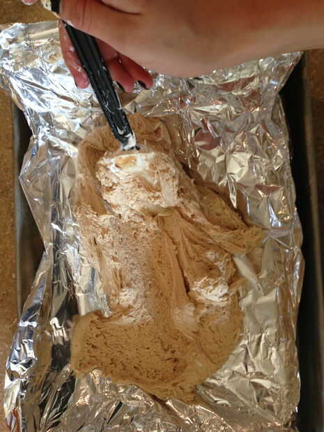 Con una espátula o cuchara de mezcla separó la mezcla de crema y mantequilla de maní en una capa uniforme en la sartén.