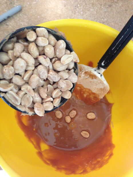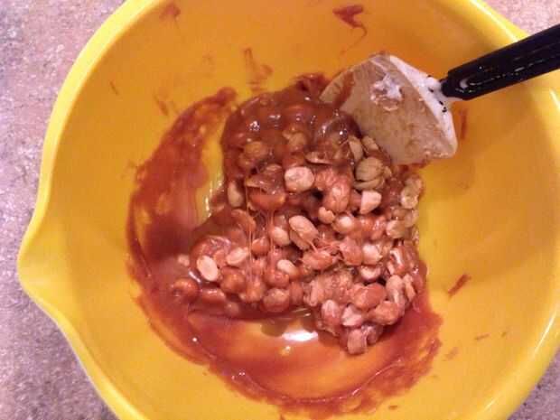 Agregue 1 taza de maní y revolver hasta que combinado uniformemente. Calentar en el microondas durante 30 segundos más.