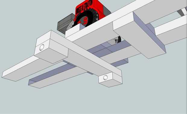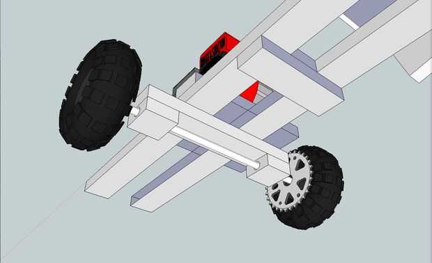 Colocar una viga por debajo el motor e instalar bloques debajo que a ambos lados. Haga agujeros en ambos lados para el árbol. Inserte el eje y coloque el piñón al eje o rueda e instalar las ruedas.