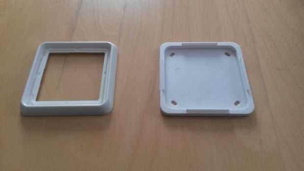 Der Wandschalter de HomeMatic HM-PB-2-WM55-2 ist etwas zu hoch, vestir hombre NHI direkt mit einem CD581 Jung 1-Fach Rahmen disfruta könnte. DAHER ist eine Adapterplatte nötig. Diese sorgt dafür, dass der Rahmen etwas weiter von der Wand weg sitzt und dient gleichzeitig als Halterung für die Grundplatte des HM-PB-2-WM55-2.