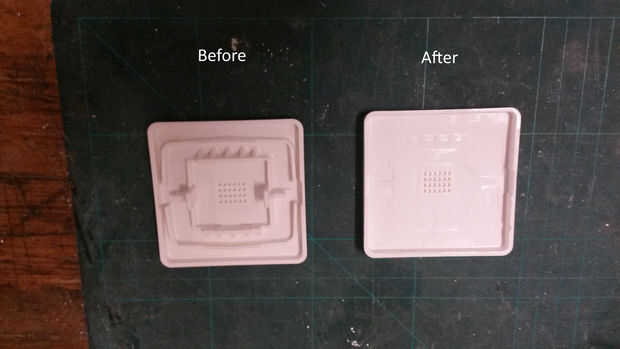 Vestir hombre muere Schalter-Abdeckplatte auf dem HomeMatic Schalter ankleben kann, müssen alle Montage-und Zentrierstruckturen auf der Rückseite der Abdeckplatte eliminado werden. Das geht am besten mit einem Dremel. Nachdem die gröberen Struckturen mit einem Fräser eliminado sind, muere hombre de sollte Reste noch mit einem Schleifaufsatz entfernen. Mueren Dremel Schleifpapier Aufsätze haben hier bei mir sehr gut funktioniert. Wie im Bild zu sehen, muss die Innenseite conjunto glatt sein.