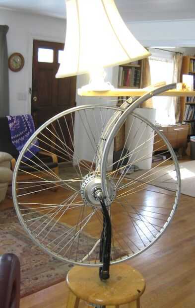 Esto es una lámpara led de modo dual para conectar una bombilla de LED de la CA o vuelta a sí mismo para alimentar LEDs DC (con respaldo de batería.) Elija la opción verde con última LED 9.5 vatios bombilla de Cree o vaya más con tu propio poder. Y estar preparado para las interrupciones eléctricas por actualizado rueda de la bici de duchamp con su rueda motor eléctrico del eje de giro. Como la rueda gira se genera y almacena electricidad en una batería debajo del asiento. Mueva el interruptor y los poderes batería 3 x 2 vatio LED en la base de la lámpara.