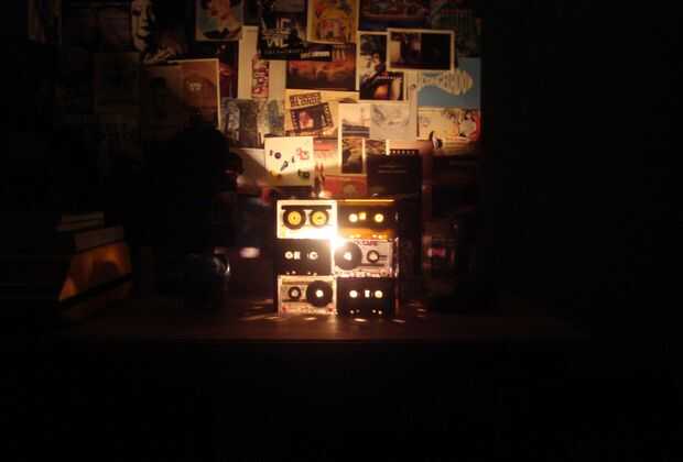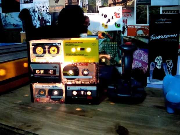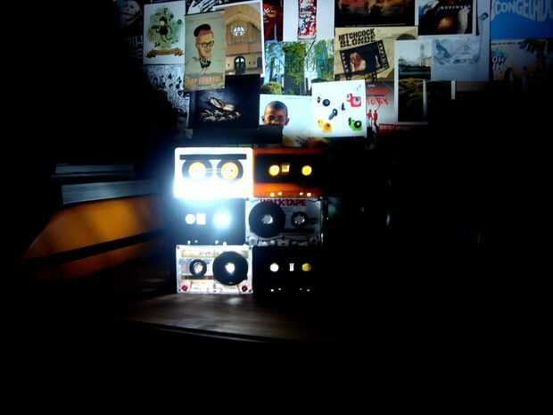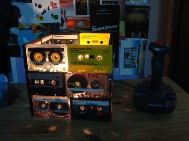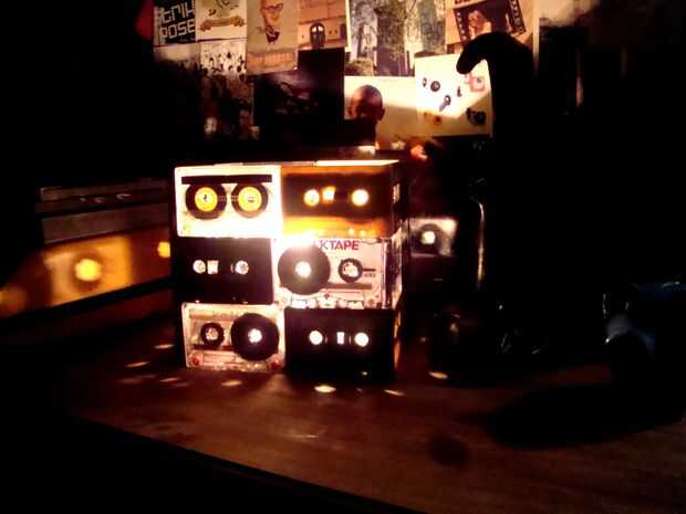 Esta lámpara está hecha de cintas de Cassette, y adapté un Joystick viejo como un interruptor.