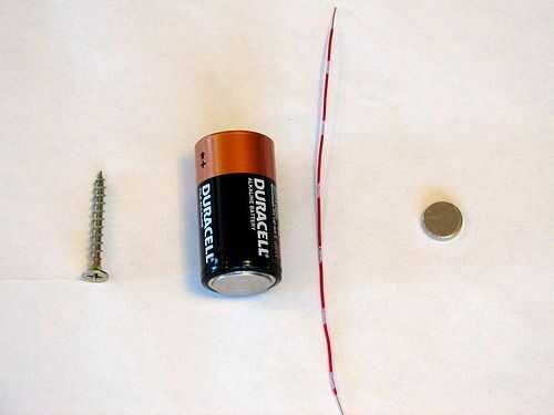 D-batería, imán plano, barra de algún tipo (yo usé un tornillo), alambre de cobre, Casing(optional), plano pieza delgada de plastic(optional), interruptor (opcional),