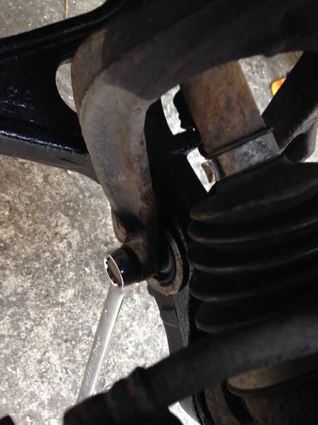 A continuación retire la tuerca y el perno que sujete la horquilla inferior a la horquilla. Fotos de 17mm 1 y 2.