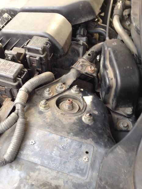Quite los cinco tornillos en la parte superior de la imagen siguiente puntal (bajo el capó). Recuerde que el puntal caerá cuando deshaces los pernos!