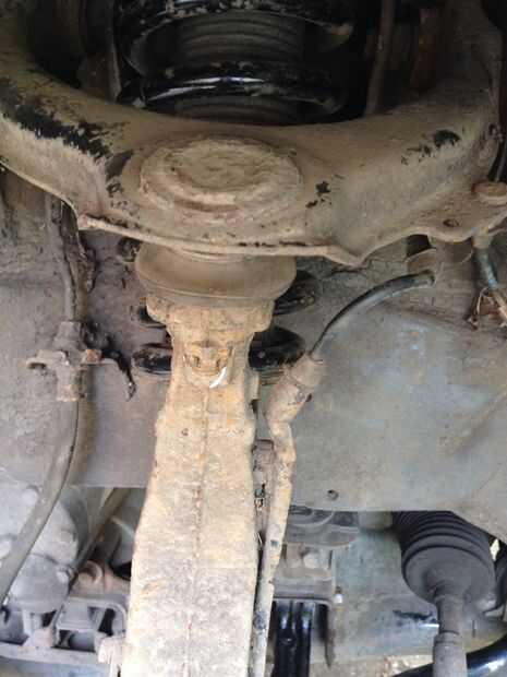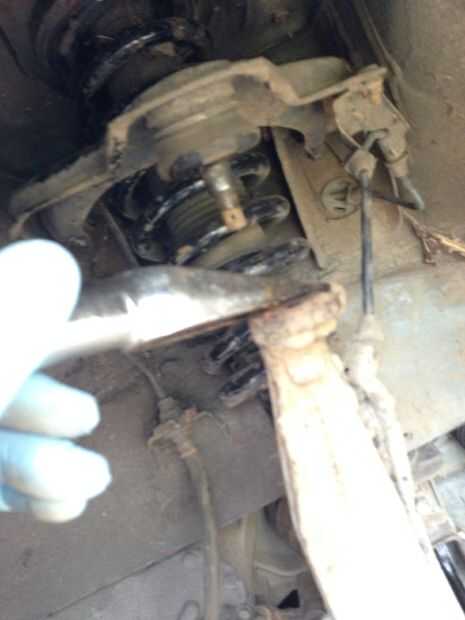 Siguiente trabajo es para dividir la unión esférica. Quite el pasador que atraviesa la castilated tuerca que sostiene el nudillo a la articulación de rótula superior. Afloje la tuerca. Cuando hay algún espacio entre la tuerca y el conjunto se separa la articulación esférica. Usé un tenedor de divisor común de bola.