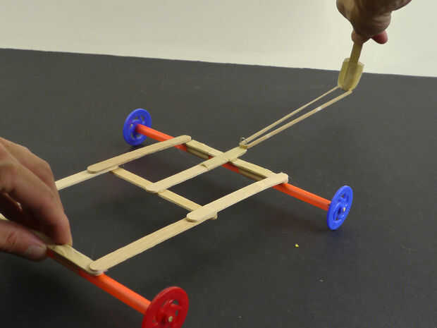 4. Cuelgue el gancho de la goma elástica y comience a tirar el coche hacia atrás hasta que la banda se coge en el gancho.