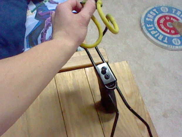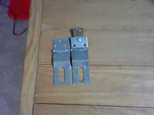 Primer lugar, retire el tornillo más cercano a la horquilla del tirachinas. Este tornillo se mantenga en su guía para tornillos de Cruz. Luego, mediante cualquier método, por favor (yo prefiero una esmeriladora de banco), moler una pequeña media luna de la parte inferior de la mitad de la bisagra resistente. mi bisagra modificada está a la derecha. como se puede ver, no es una luna muy grande, apenas lo suficientemente grande como para alojar el tornillo trasero de la Honda.