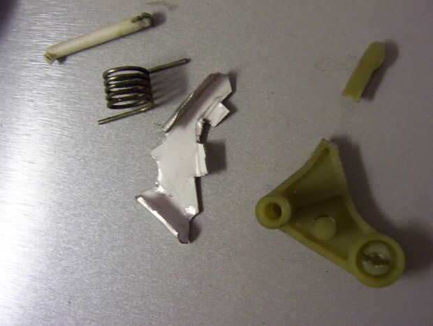 Con el pedazo roto eliminado consigue un trozo de aluminio o estaño que puede ser fácilmente doblado con los alicates y corta con unas tijeras. Forma similar a lo que está en la foto, asegurándose de que algunas partes de él que pueden envolver y sujetar las piezas de plástico.