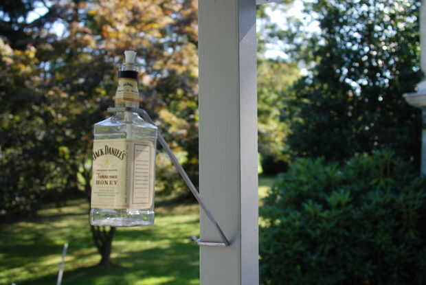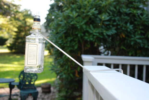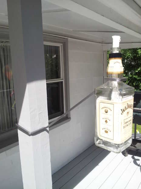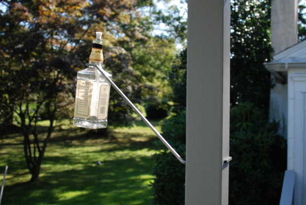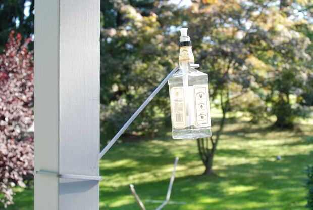 Vi un artículo en Lifehacker para una antorcha tiki de botella de vino y pensé que era inteligente. El lado negativo de ese proyecto para mí fue la elegante botella mira con las piezas de soporte busca barato. Además se produjo la perforación de agujeros en cosas que no quiero hacer y también hace derribar las botellas más adelante un dolor.