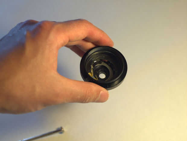 Encontrar la muesca en el borde del conjunto del lente.  Utilizando un destornillador pequeño para aplicar en sentido antihorario fuerza, desatornille el conjunto de la lente de la base de la lente.