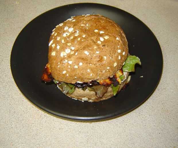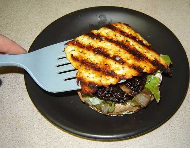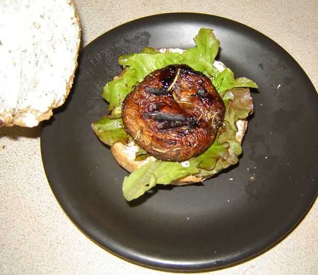 ingredientes de la hamburguesa de Portobello:Hongo Portobello--Cebolla-Berenjena-Tomate-Aguacate-Queso azulPreparación-Remojar la berenjena en agua caliente con sal durante 30 minutos.-Cocinar la cebolla, berenjena y patata dulce en aceite de oliva y