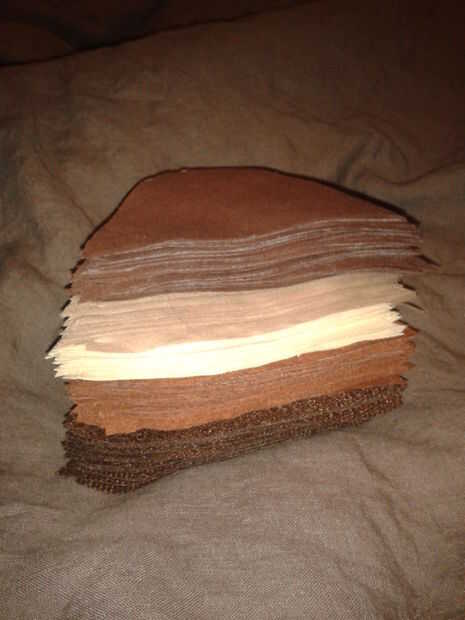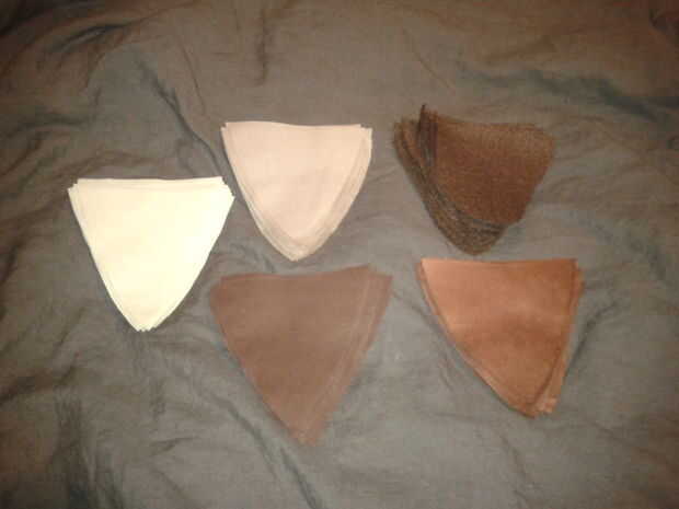 Para crear las plumas recortar una plantilla de tarjeta de papel stock en el tamaño y la forma que yo quería las plumas en. Yo entonces remontarlo una y otra en la parte trasera de mi tela con tiza. He usado 5 diferentes colores/texturas de telas. Después de trazado corte las plumas.