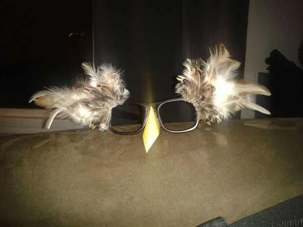Utiliza una selección de marrón y blanco elaboración de plumas de la máscara. Pegado en capas a un par de vasos de plástico hasta que entro el aspecto deseado que iba para. El pico fue hecho de cartulina que recorte y sujetado en una pistola de pegamento caliente.