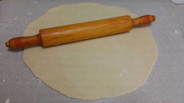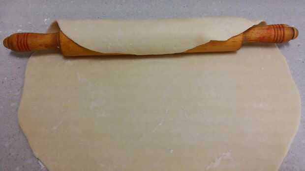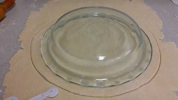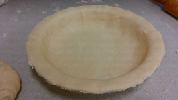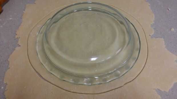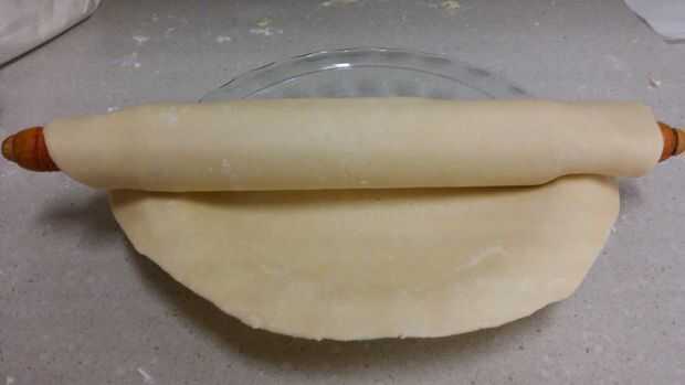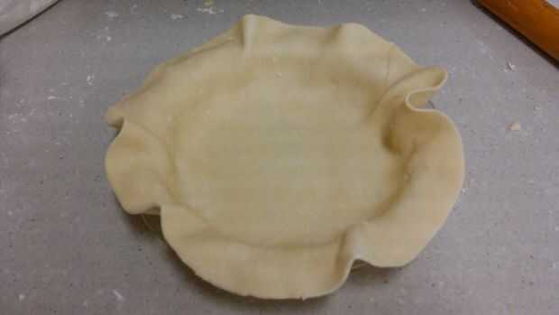 Con un rodillo, estirar la masa a un gran círculo alrededor de 15" diámetro. aproximadamente 1/8" de espesor. Si la masa está pegajosa al contador, colocar un poco de harina entre. Voltee la tartera en pastelería. con un cuchillo, corte alrededor 1" más grande que la tartera. Rodillo masa a perno de balanceo y transferencia en tartera.