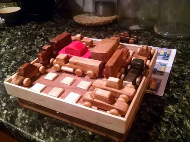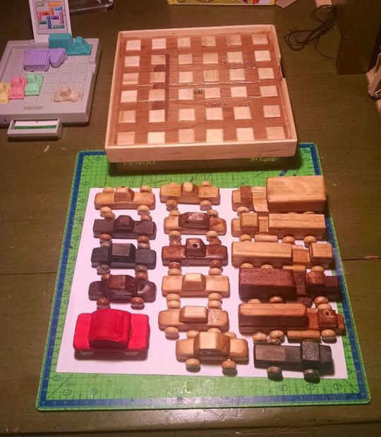Para el coche rojo, yo sólo había compuesto por una solución de colorante rojo y agua empapado y lo pintó en. Tengo en mi taller varias manchas de color. Usé 3 los diferentes y luego termina por mezclar un poco de dos de ellos para darme algunas variaciones de 4 color en los coches. I capa de poly-urathane es todo lo que necesita ahora.