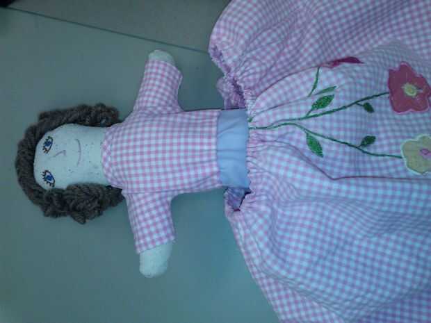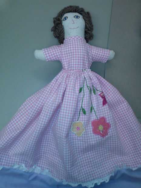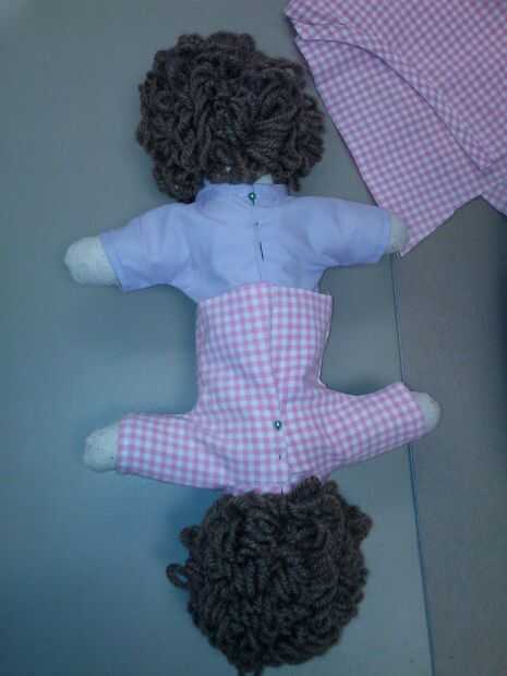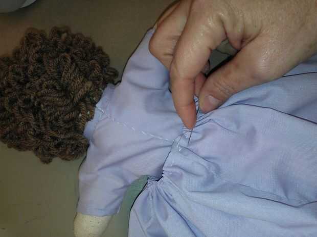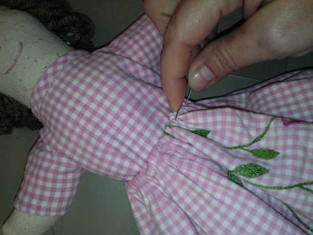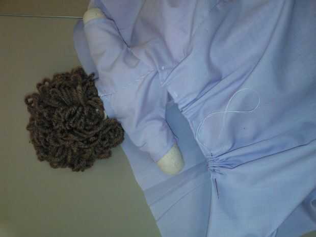 Coloque ambas tapas sobre la muñeca. Las costuras la puntada de la mano hacia atrás. Gire el borde superior de cada falda abajo por separado aproximadamente 1/4" y con una aguja y un hilo de rosca, se reúnen alrededor de todo el camino. Coloque la falda de la muñeca. Tire firmemente del hilo y cose sobre la muñeca. distribuir a la tela uniformemente alrededor de la muñeca y coser el faldón sobre la muñeca. Repita con el otro lado.