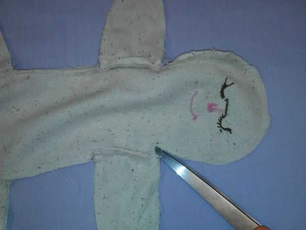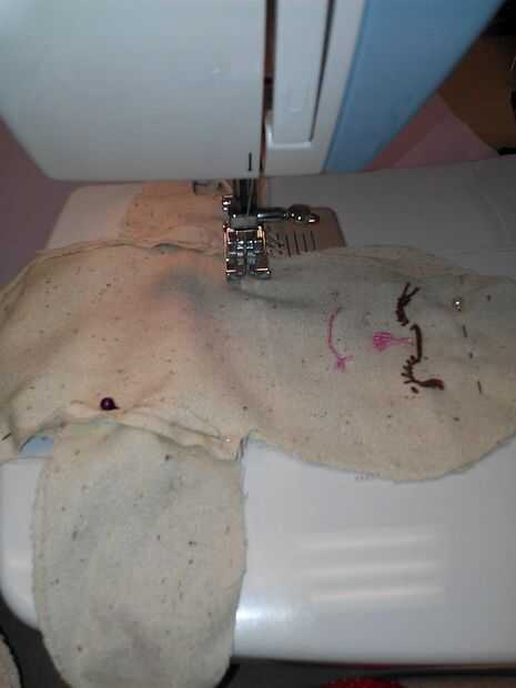 Puntada alrededor de la muñeca entera, excepto dejar una abertura de 2" de ancho en uno de los lados de la máquina. Recorte las esquinas hasta, pero no a través de la costura. Gire a la derecha hacia fuera.