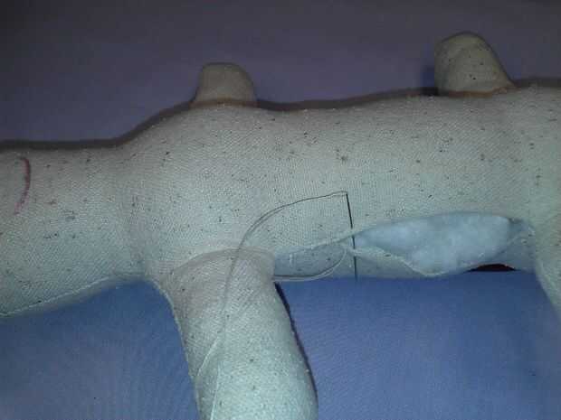 Coloque trocitos de relleno dentro de la abertura en el lado de la muñeca. Asegúrese y obtener suficiente relleno en cada brazo. Utilice el extremo de la goma de borrar de un lápiz para empujar el relleno en la muñeca. Coser la abertura con un hilo y aguja.