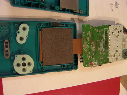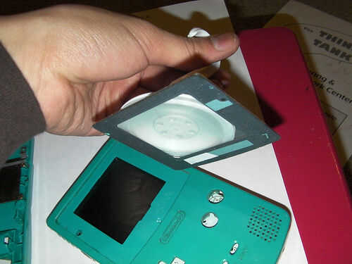 Para quitar la pantalla, primero debe quitar la pantalla del chip pero abriendo dos bisagras en la parte posterior del chip en la parte superior. Siguiente usando una bisagra Copa de succión, salga de la pantalla frontal de plástico fina de la Game Boy y luego saque el vidrio de la pantalla de la parte superior de plástico.