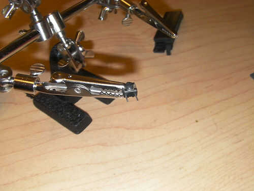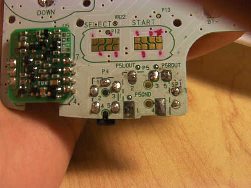 Start y Select es conectada por los cables de tierra y normalmente usted tendría que usar el voltímetro para ver cuáles están conectados. Por suerte para usted, sin embargo, ya marqué que son la Señal de almohadillas (las específicas de la cierto botón) y los Cojines de suelo (ésos ya conectado) sin marcar. Lo único que tienes que hacer es aplicar soldadura a cada una de las pastillas de señal, conecte un cable del interruptor de botón pulsador momentáneo a cada uno y conectar los otros cables uno al otro. Esto completa el circuito y nos permite utilizar los botones Select y Start en la parte delantera de Beemo.