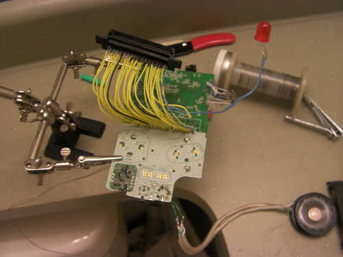 - Alimentar el cable del controlador a través del pequeño orificio Beemo, creado en el paso 7 y luego de la soldadura de cada uno de los cables a los electrodos correspondientes. Para el Cable de tierra, conecté a la almohadilla de la mano derecha cobre de fondo en la Game Boy.