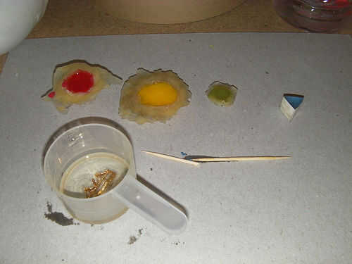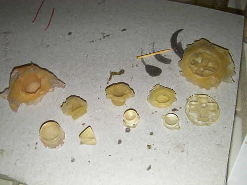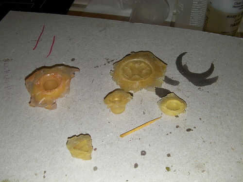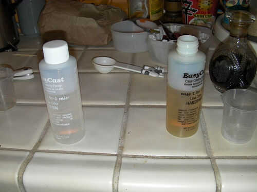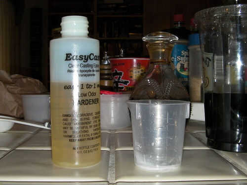 Hablando de eso, si has visto mi Instructable anterior para Video juego mes libre Z Video juego hielo moldes entonces usted sabrá lo fácil que es usar Molde constructor. Simplemente coloque un objeto en papel de cera, del cepillo en el molde en capas y después de un día o dos que se obtiene un molde perfecto del molde. Para construir las piezas de plástico, sin embargo, utilizaré Fácil molde la resina de Epoxy que es un poco más difíciles y más complicados usar. La ECER es una mezcla de dos botellas, el endurecedor y la resina, por lo que tendrás una taza de papel disponible para estimar las cantidades necesarias. Debe ser la mezcla de resina a endurecedor: 1/3 y 2/3rds, de lo contrario la mezcla no endurecen en todos. También sólo iniciar pintura después de que los moldes o toda la mezcla será muy líquida.