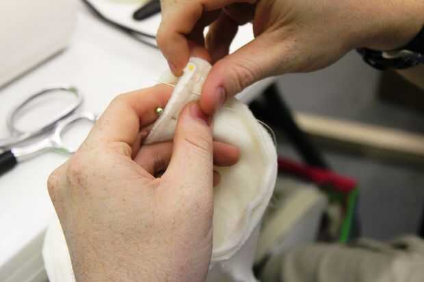 Una vez que los agujeros se cortan, las orejas en lugar del pin. Recuerde a los "derecha a" flip antes de fijar en sus respectivos agujeros. Ahora que están en su lugar utilizar una puntada atrás (a mano) para fijarlos.