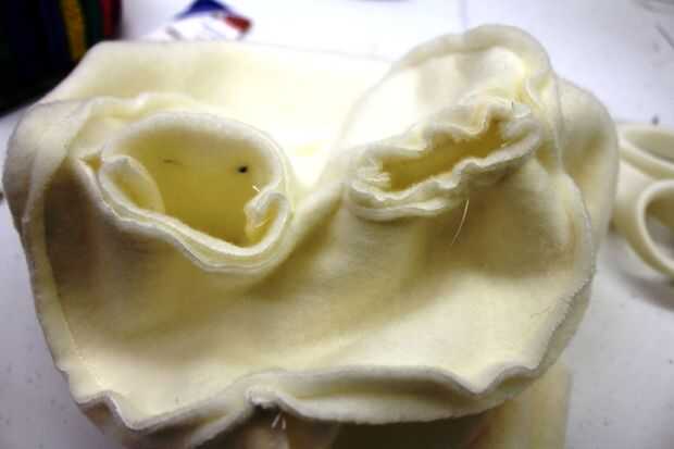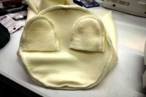 Las orejas en esta imagen son un poco más grandes que la que se incluye en el patrón. Para asegurarse de que los agujeros son del tamaño correcto, tirón de orejas, por lo que son "el lado derecho hacia fuera." Esto es lo que voy cosiendo en. Corte sus agujeros (sólo en una parte del sombrero, dejar al otro solo por ahora), teniendo en cuenta que la costura de la "Principal de la aleta" para actuar como un marcador en la parte posterior del sombrero.