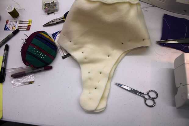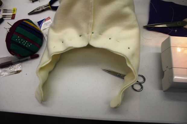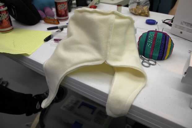Tomar la pieza sin oídos y coloque sobre la mesa. A continuación, tomar la pieza con la orejas y ponerlo dentro de la parte que usted acaba de poner sobre la mesa. Asegúrese de alinear las costuras de la espalda. Una vez que tengas todo alineado, pasador a lo largo de la orilla ajena. Usted va ser coserlo casi totalmente juntos, excepto necesita dejar un espacio de 2-3 pulgadas en cualquier lugar de la pieza para darle la vuelta derecha hacia fuera. Elegí una sección a la licencia por la costura trasera abierta.