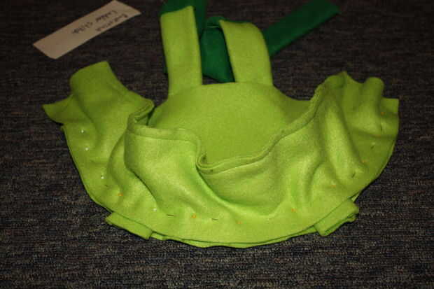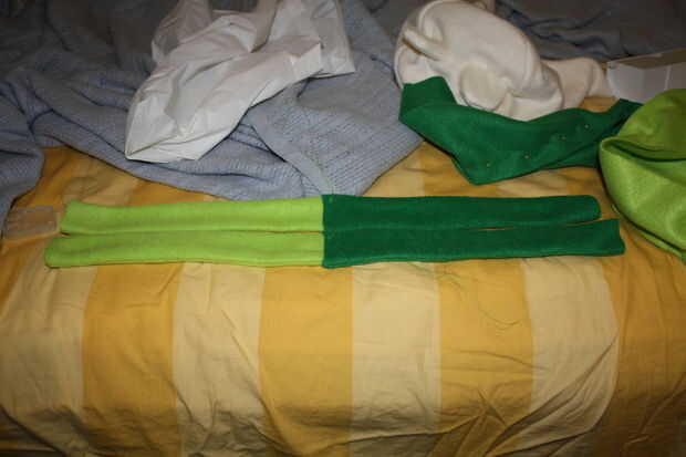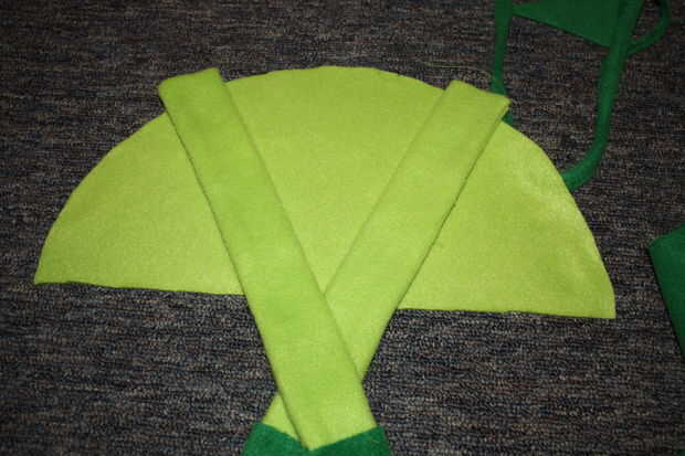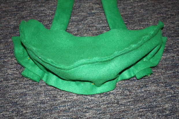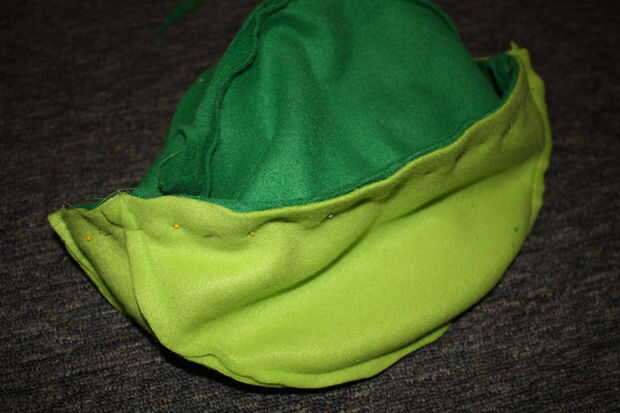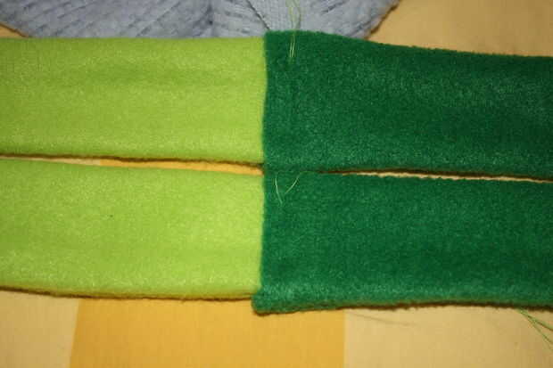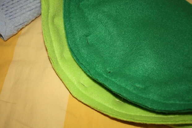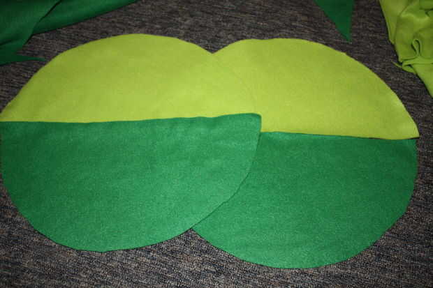 - Ahora tenemos que coser por el medio de la manada, colocar las partes verdes claros y oscuras. Ha sido dentro de hacia fuera todo el tiempo, por lo que necesitará dejar cerca un agujero de 2 pulgadas para que usted puede voltear el paquete entero.
