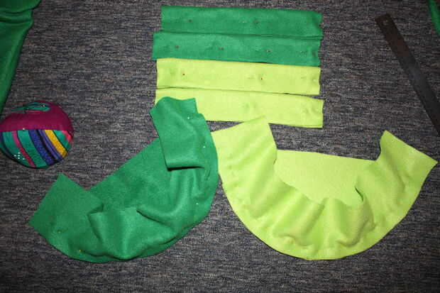 - Perno de cada una de las tiras de largo 22" para el borde redondo de color correspondiente de medio círculo y coser a lo largo de ese borde.