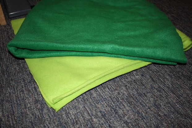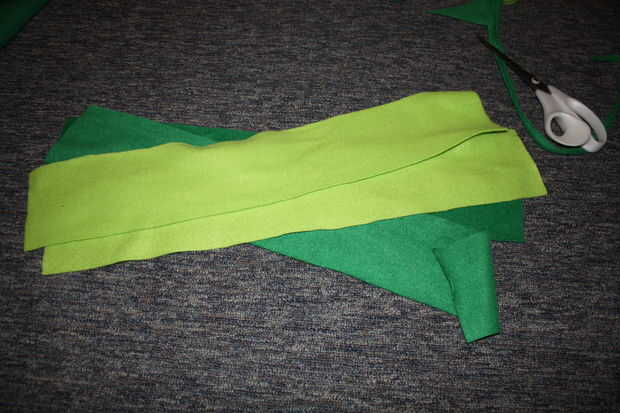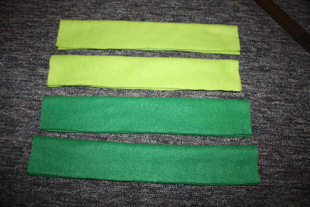 - Corte un color verde claro y un verde oscuro por la mitad, por lo que tendrá (x4) tiras de 11 "x 4" y (x2) tiras de 22 "x 4".