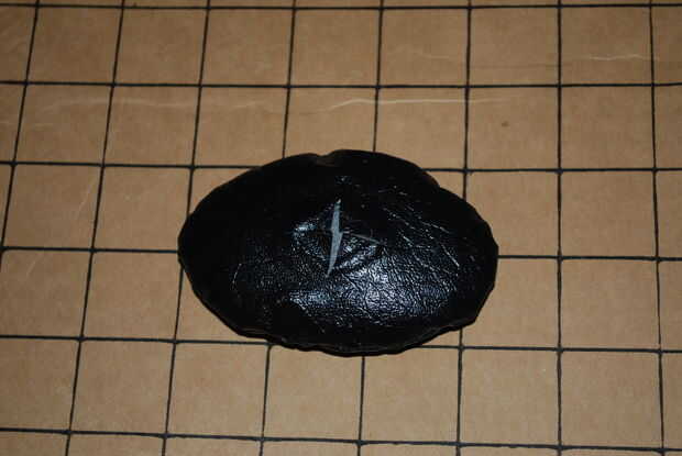 Mano-punto negro doblado doble cinta alrededor del agujero de la boca/cara y mano-puntada o pegamento 3 dientes blancos en la parte superior (utilicé vinilo).