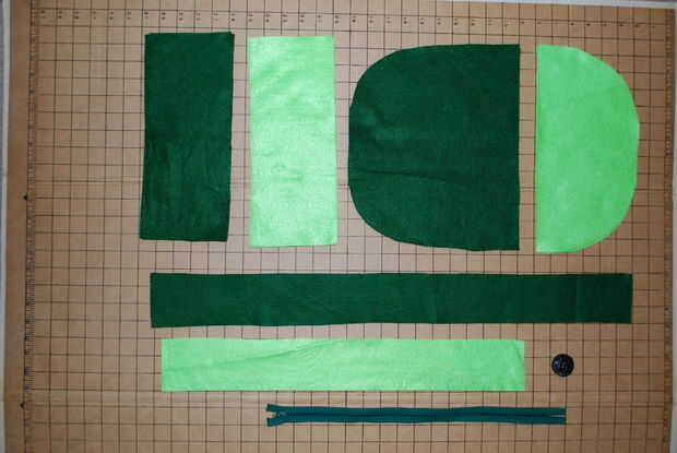 Para las bandas: verde oscuro corte 2 tiras de 5 pulgadas de ancho por aproximadamente 12 pulgadas de largo (de 10 pulgadas de largo si la mochila es para un niño). Cortar tiras de verde luz 2 5 pulgadas de ancho por aproximadamente 10 pulgadas de largo (8 pulgadas de largo si la mochila es para un niño).