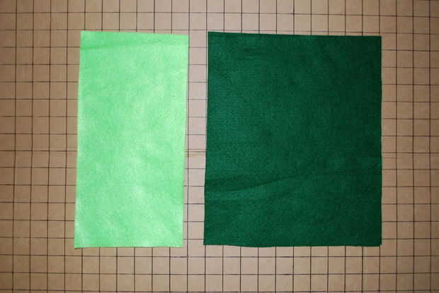 Cortar 2 rectángulos de tela verde luz 12 pulgadas de ancho por 6 pulgadas de largo. Cortar 2 rectángulos verdes oscuros 12 pulgadas de ancho por 10 pulgadas de largo. Río de estas piezas y los cantos.