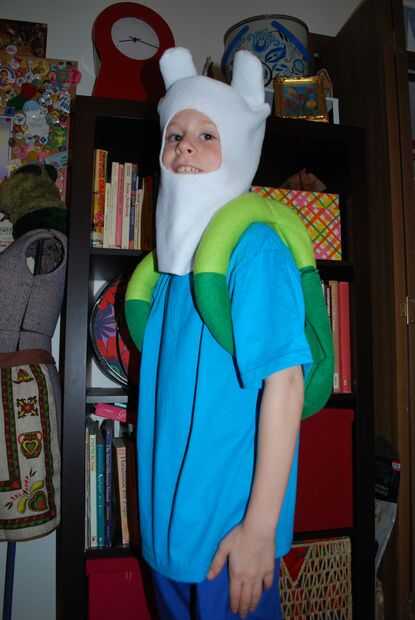 Mis hijos aman Adventure Time. Decidieron que querían ser Finn y Jake para Halloween. La historieta es bastante nueva y no puede encontrar cualquier cosas de Adventure Time en tiendas así que tuve que hacer sus trajes desde cero. Aquí está lo que se