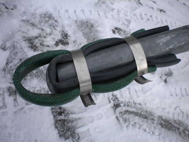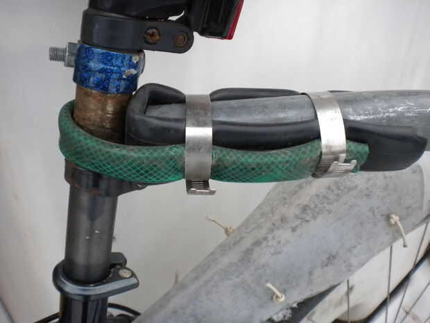 Paso 2: Con 2 abrazadera abrazaderas de manguera grande la sección de manguera de jardín sobre la sección del tubo de la bicicleta dejando un espacio sobre el diámetro de su poste del asiento entre la manguera y el tubo.