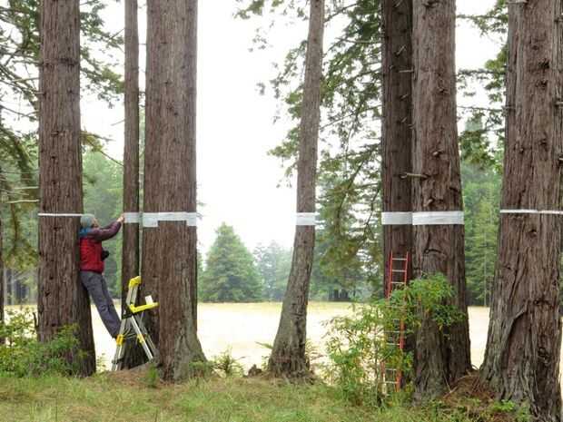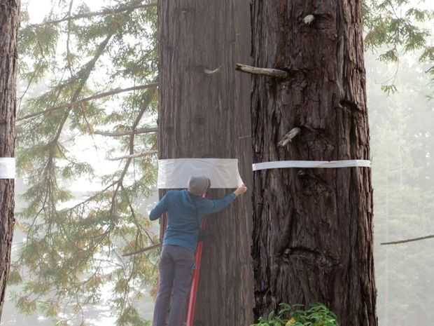 Una vez que la línea completa fue instalada en un árbol, se procedió a ajustar el ancho de línea en sus árboles vecinos para que coincida con la anchura aparente como se ve en el visor de la cámara. Pasar de árbol a árbol en esa forma y usando escaleras según sea necesario, instalamos cinta horizontal marcar líneas de 12" de ancho en 23' de altura (en el árbol más lejano) a 3" de ancho en 6' de altura (en el árbol más cercano).