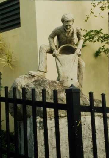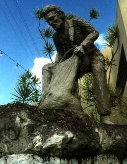 Se trata de una estatua de mi vecino, Bartolo, vaciar su cesta de la cosecha de café en un saco. Donó a la ciudad hace muchos años y se encuentra cerca de la plaza. La armadura es tubo de PVC. El resto es una combinación de materiales, pero la espuma de poliestireno es una parte importante de él. El reducido peso de esta escultura de tamaño natural de cemento permitió Bartolo, sí mismo, para llevarla a una larga distancia desde mi casa hacia fuera a la carretera (sólo la figura, no la base de piedra, que se hizo en el lugar).