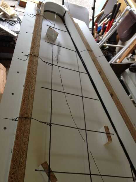 Trabajo de guía brillante de Cheng "Hormigón encimeras", hice el formulario con el tablero de la melamina. Por seguridad he optado por extremos curvados, en lugar de los ángulos agudos de la Gibson. Esto inicialmente planteaba un problema, pero fue capaz de obtener las curvas que quería utilizando diferentes diámetros de tubería de PVC. Este corte en el ángulo correcto y la sostuvo en lugar con el respaldo de bloques de la melamina. Luego plastilina fue utilizado para proteger las cabezas de los tornillos del concreto y facilitar el desmantelamiento de la forma. Todas las costuras eran calafateadas con silicona negra (fácil de ver que el blanco) y suavizadas para el perfil redondeado que quería para los bordes superiores.