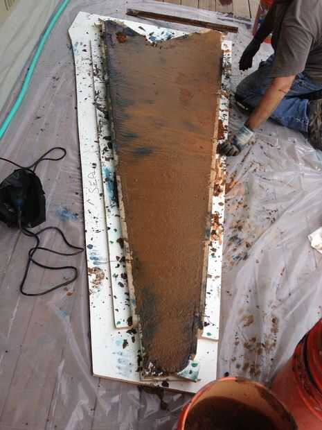 Estas fotos me muestran la mezcla de hormigón en, tratando de llenar todos los rincones del molde/formulario mientras no desplazamiento de la malla de refuerzo del embalaje. En retrospectiva creo que mi mezcla fue un poco dura e incluso después de una hora o así de vibrar el molde con una lijadora orbital me todavía estaba haciendo burbujas y tenía un número de pequeños huecos en la tabla final. Pude llenar estos agujeros con una capa de cemento antes de pulir.
