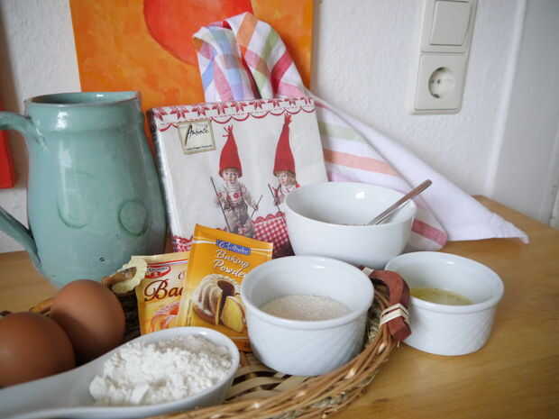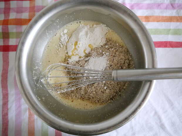 Para el bizcocho necesita los huevos, la levadura, las avellanas, la mantequilla derretida, el suelo y el azúcar.