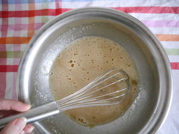 Mezclar primero el azúcar y los huevos con un batidor de huevo para sobre uno o dos minutos. Cuando hay algunos tipo de blanca espuma en el you´ve de la mezcla acabada.