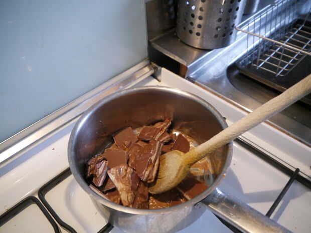 Con muy poco calor derrita el caramelo chocolate, durante este tiempo que usted puede moler sus cereales o el gavotte.