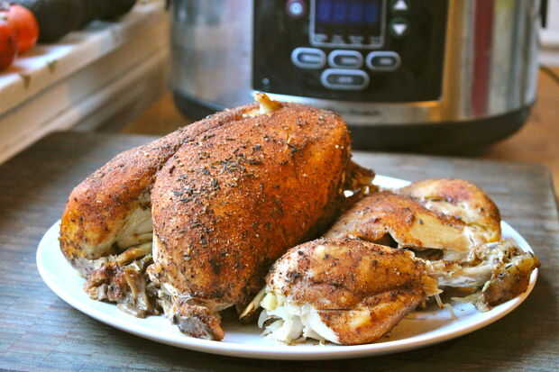 Decidí probarlo, y aunque tengo que decirte que no le ganará a un pollo de asado del horno con la piel crujiente, es una manera super sencilla y sorprendente de cocinar un pollo para tener cena 75% listo cuando llegue a casa.