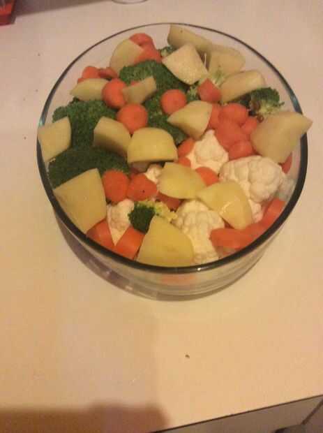 Picar las verduras y lugar en el plato de la hornada. Separados hacia fuera por lo que se cocinan uniformemente.