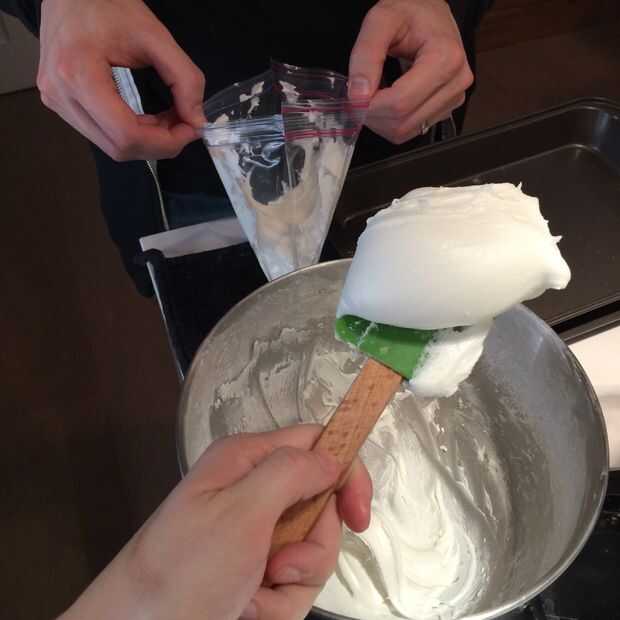 Formación de hielo actúa como cemento en la construcción del pan de jengibre. Usted puede hacer esto antes de tiempo pero nada expuesto al aire se endurece por lo que recomiendo poner en una manga pastelera o una ziplock que puede sacrificar. Cuando estés listo para construir, cortar el la esquina de la bolsa para permitir que la cantidad correcta de hielo hacia fuera a la vez.
