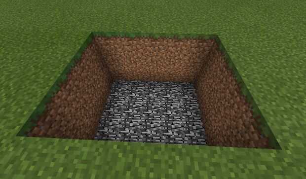 En primer lugar, simplemente haga un agujero con una longitud de 5 cuadras, una anchura de 4 bloques y una profundidad. Mira la foto para más de una idea.